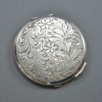 Notes: Vintage sterling silver powder compact case with mirror, of circular form, the top having an asymmetrical engraved intertwined floral motif, the back left smooth.