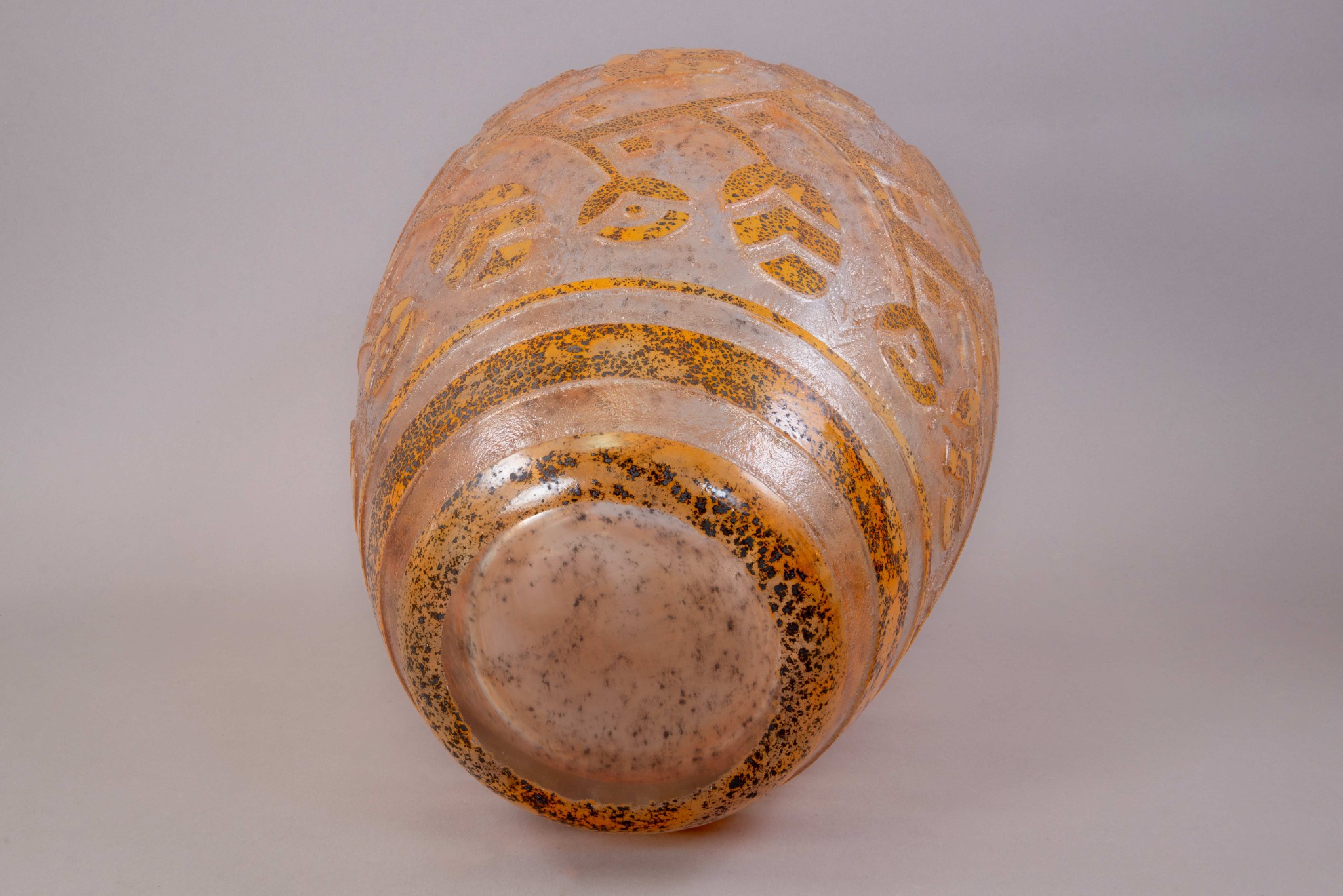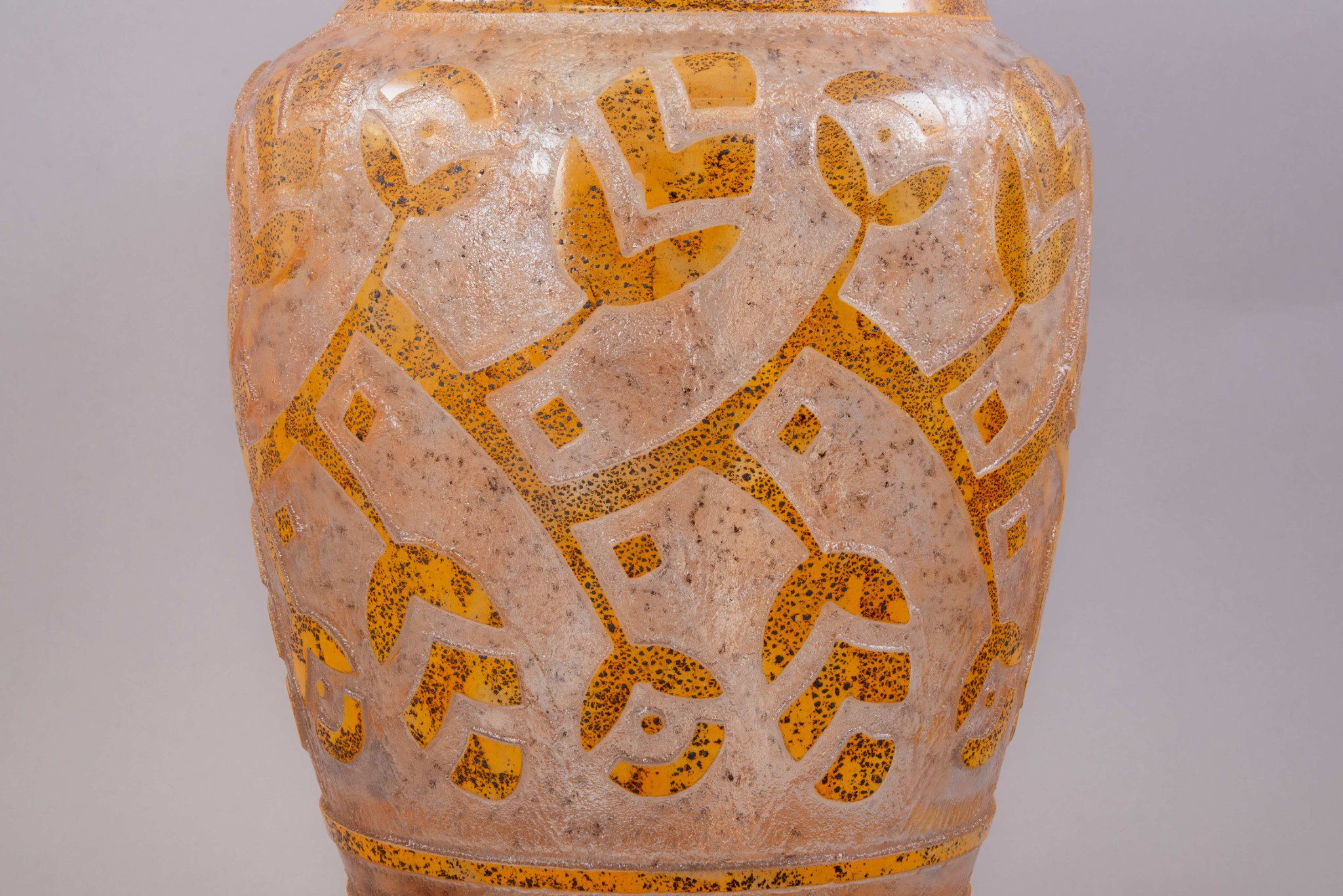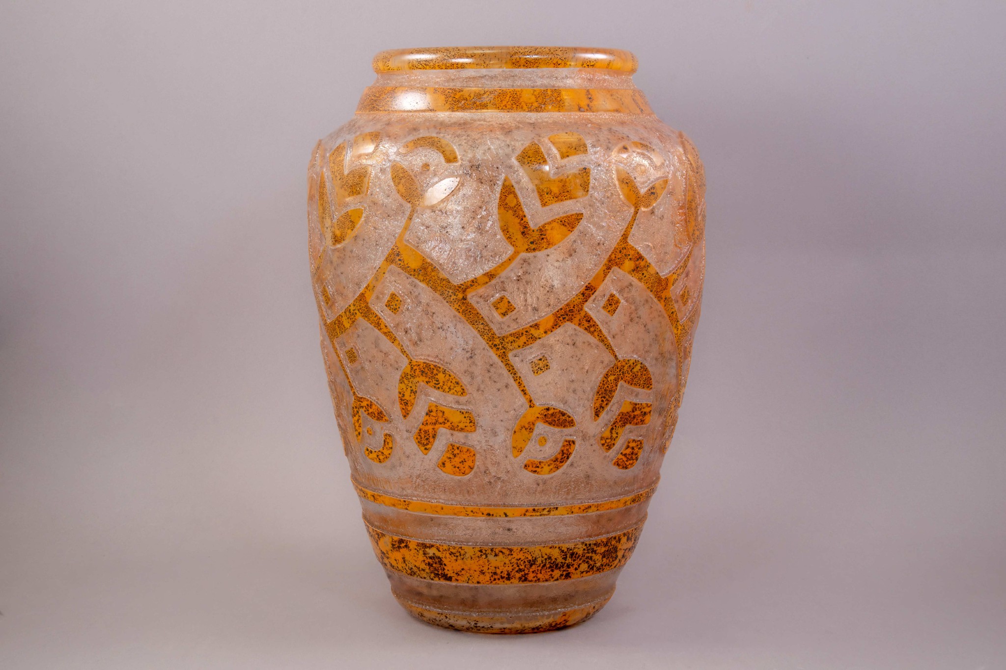Notes: A Daum Art Deco vase of amber over clear crystal deeply acid-etched with a repeating stylized wild rose motif.