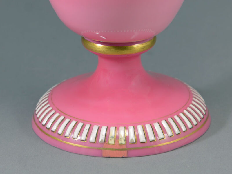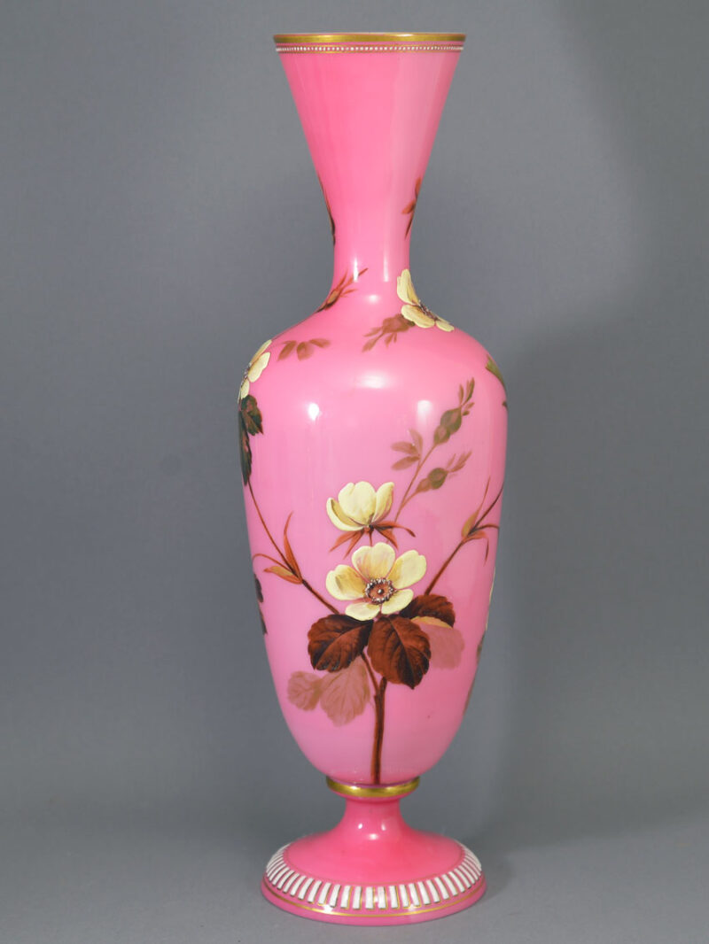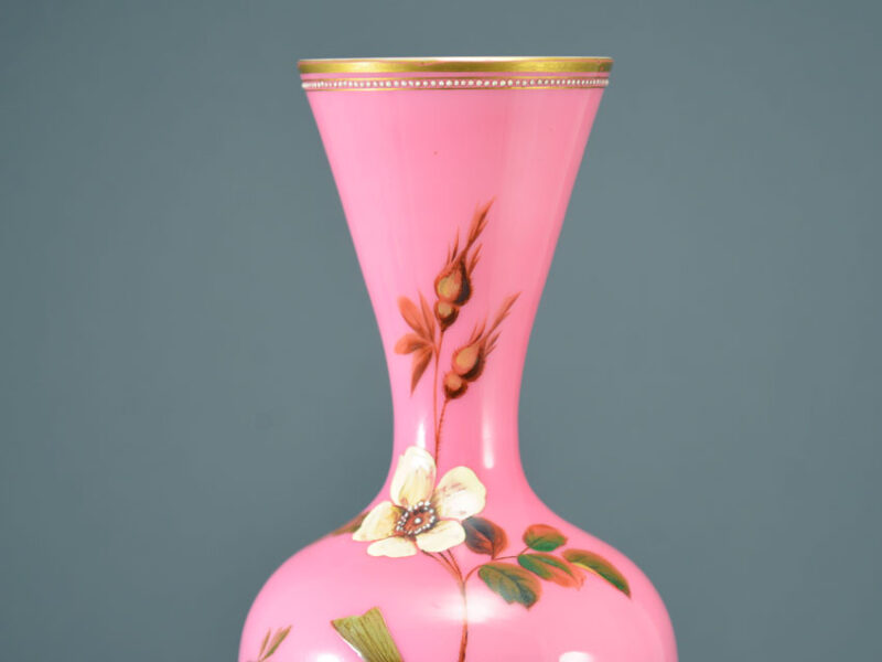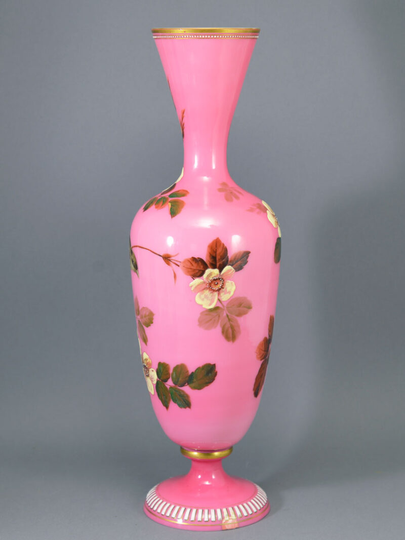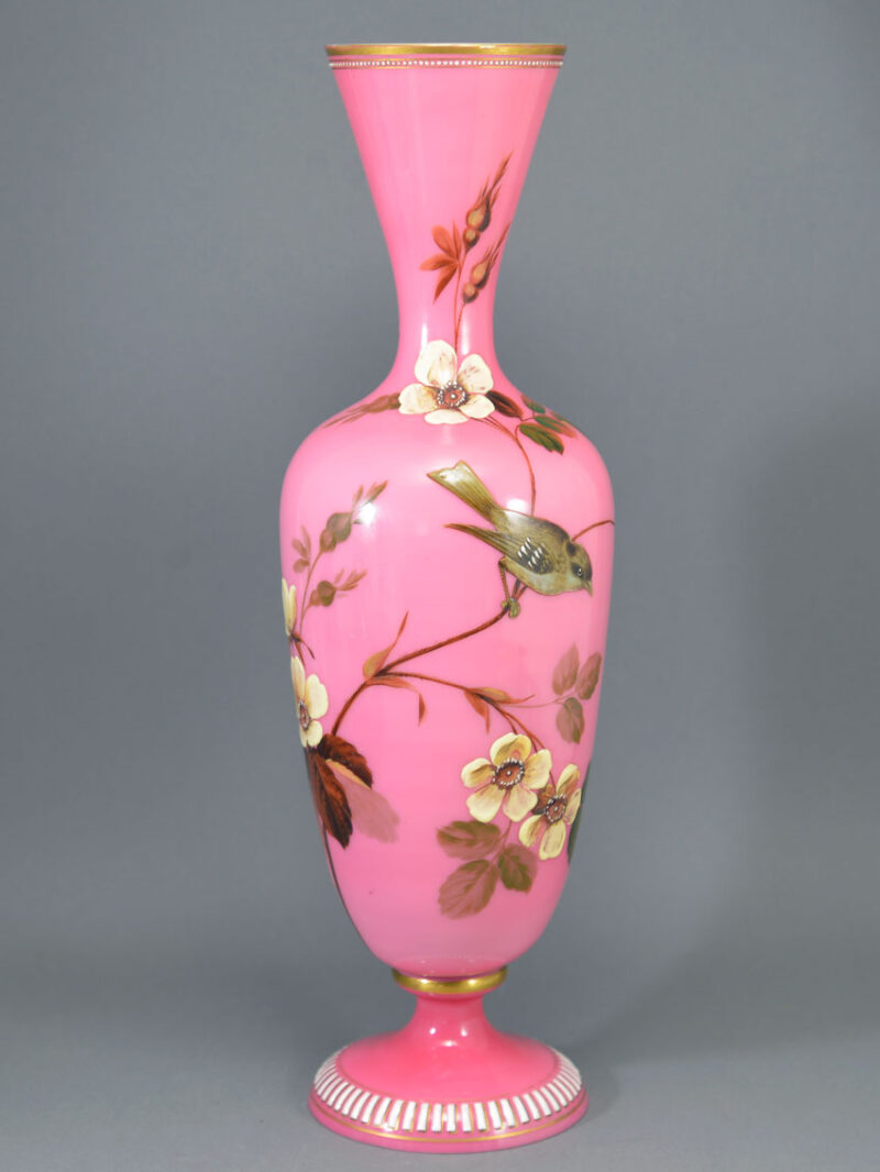 Description & Notes: Stunning hand-enamelled pink over white opaline mantle vase attributed to Baccarat, France. The shouldered baluster body has a cinched neck and a trumpet mouth, and is raised on an attached softly domed foot. It is decorated with opposing sparrows sitting among the branches of a wild rose bush, one vase yellow, the other white, and the rim and foot embellished with raised ‘jewel’ and gilt borders.