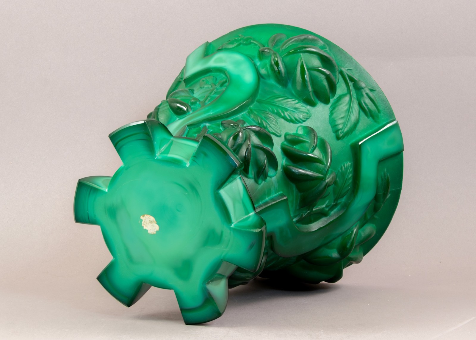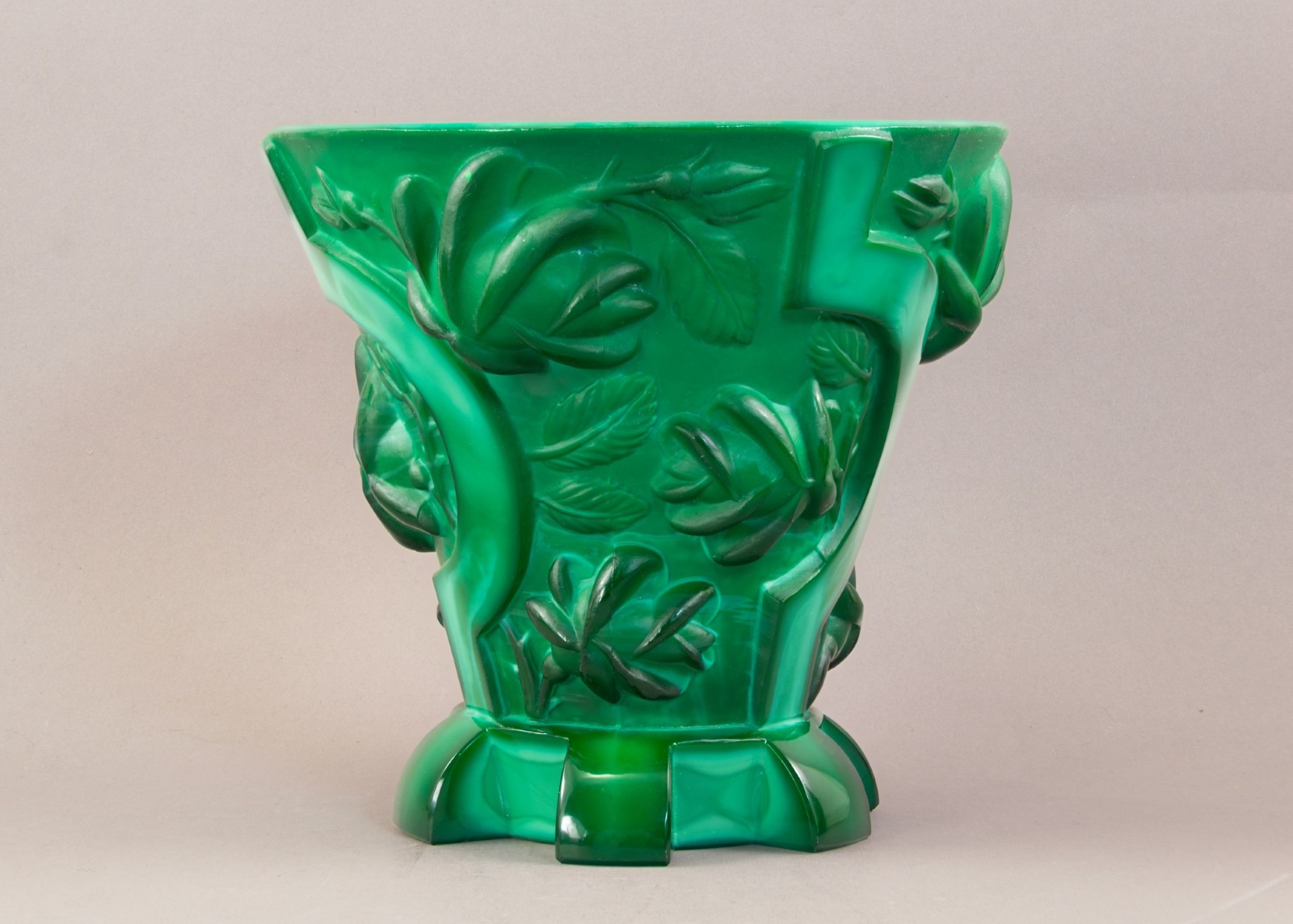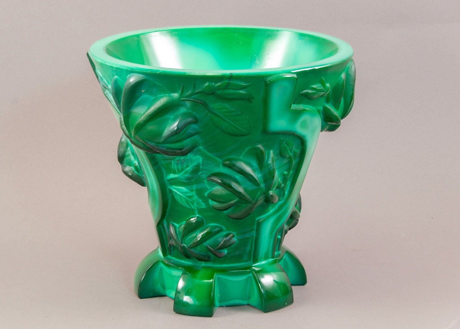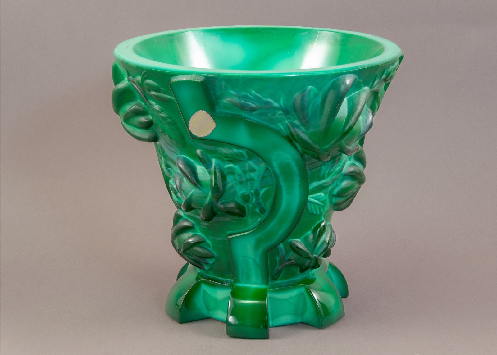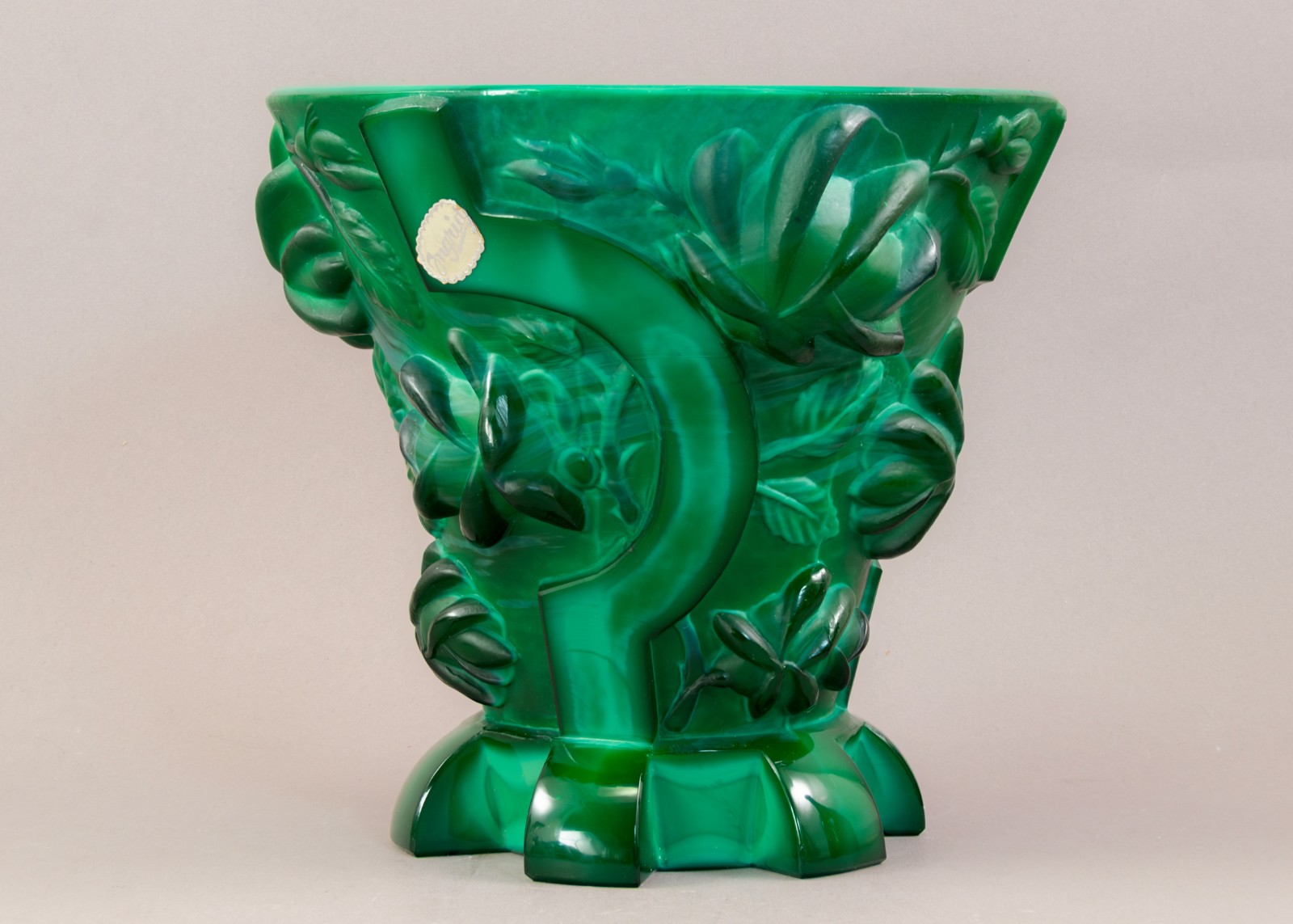 Notes: The substantial art deco vase is made of malachite glass and sports deep relief roses and sickles with a gear base, a camouflaged departure from their typical decorative wares of nudes, flora and fauna. Designed by Alexander Pfohl for the Schlevogt Ingrid brand c. 1936 it’s symbolism wouldn’t have escaped anyone.