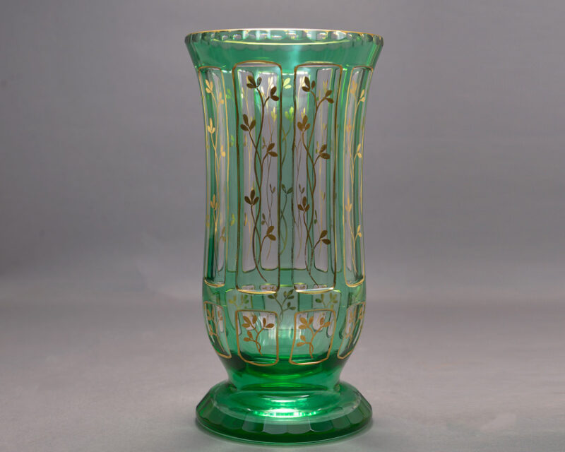 A Josephinenhütte (1842-1983) crystal art glass facet cut green cut to clear vase with slightly flaring mouth, raised on a solid integral faceted foot. Around the body are two rows of evenly spaced vertical panels, long around the upper section and short around the lower curve, helping to further define the form. Each panel is defined in gilt trim and further embellished with hand-painted intertwined golden leaves. The faceted mouth and base are flat cut, polished, and appropriately unmarked.