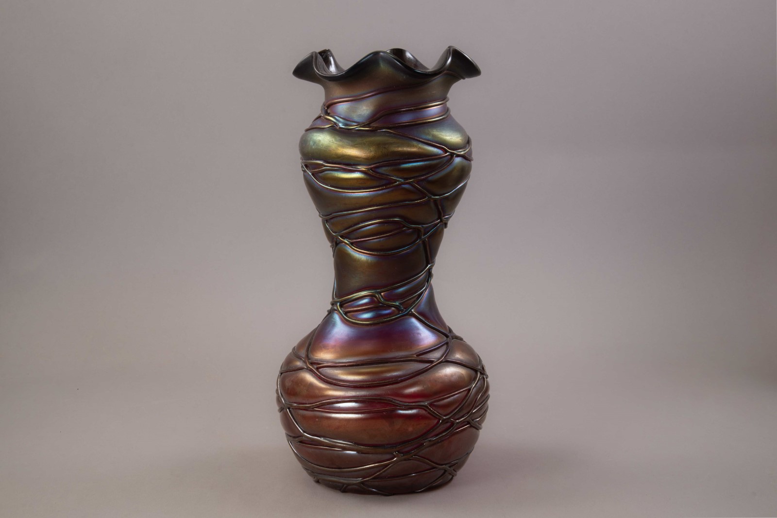 Notes: A Kralik & Söhne ‘Threaded/Veined’ ruby glass vase of an elongated double gourded form with a ruffled mouth, the glass is further finished with an iridescent gradient with blues, greens, and yellows especially strong around the waist, shoulders and neck.