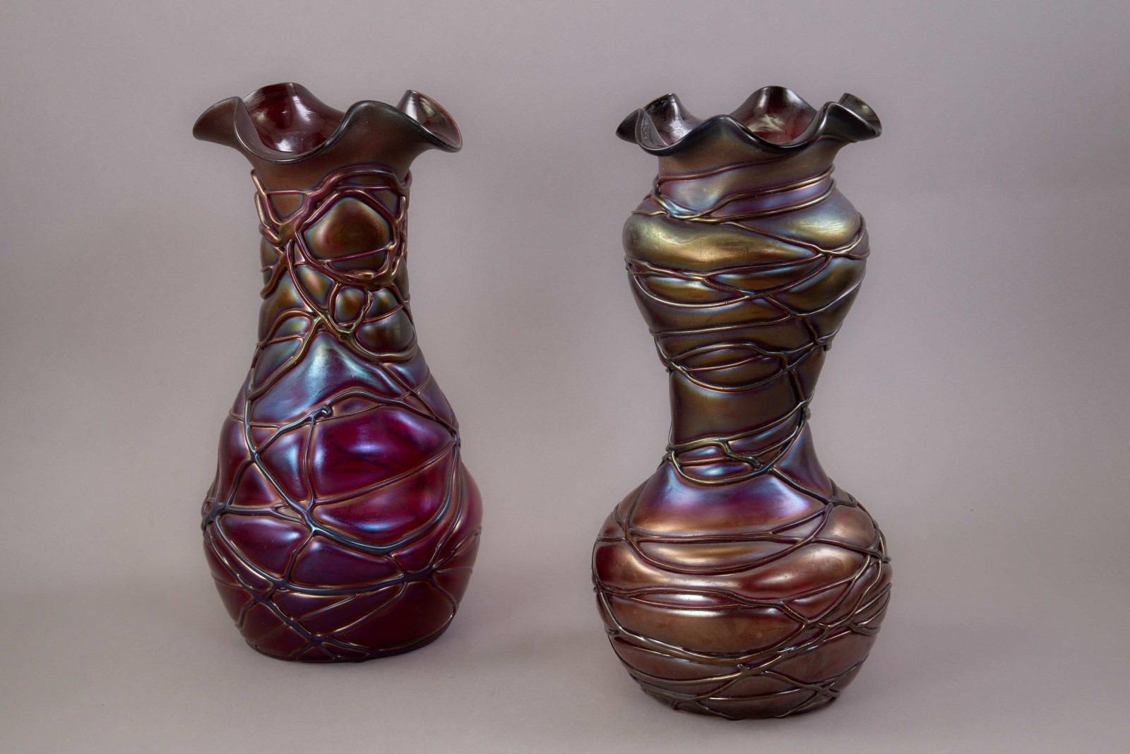 iridescent; veined décor; mould blown red glass