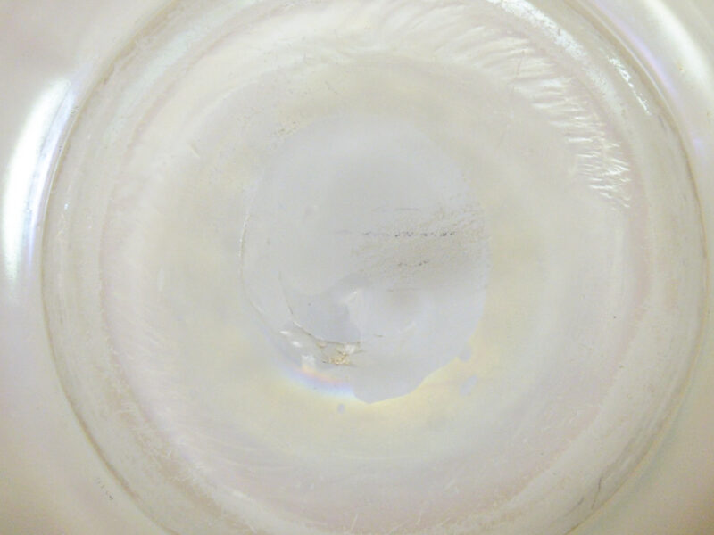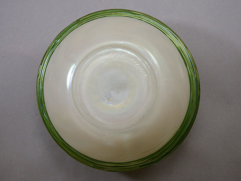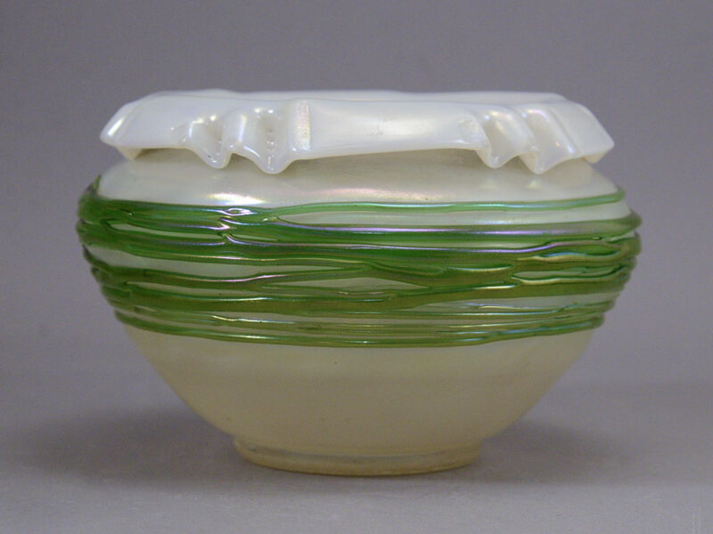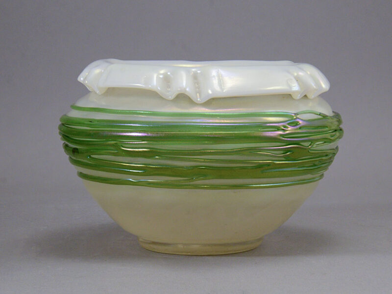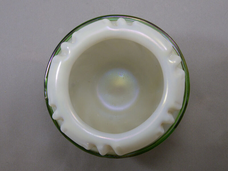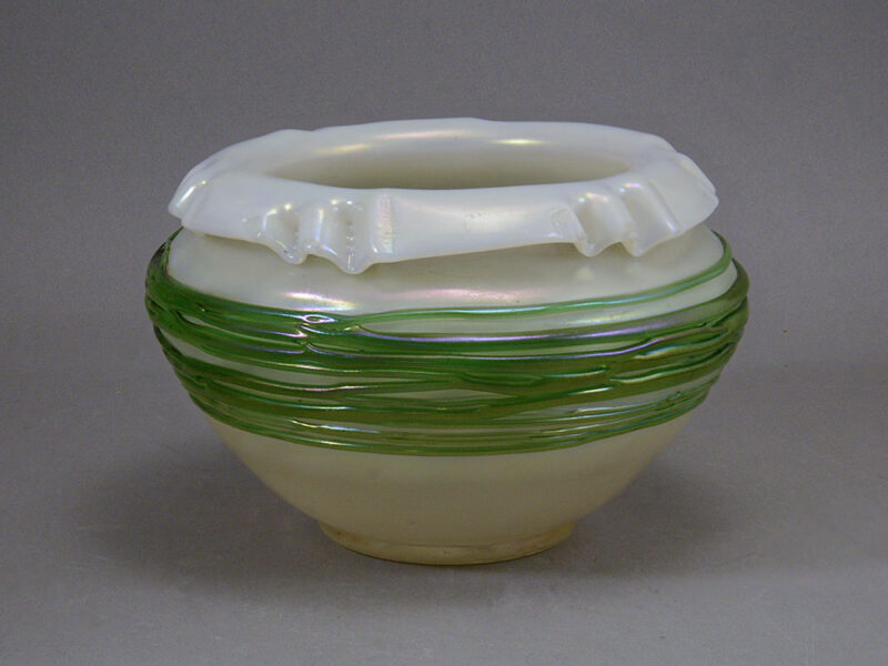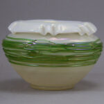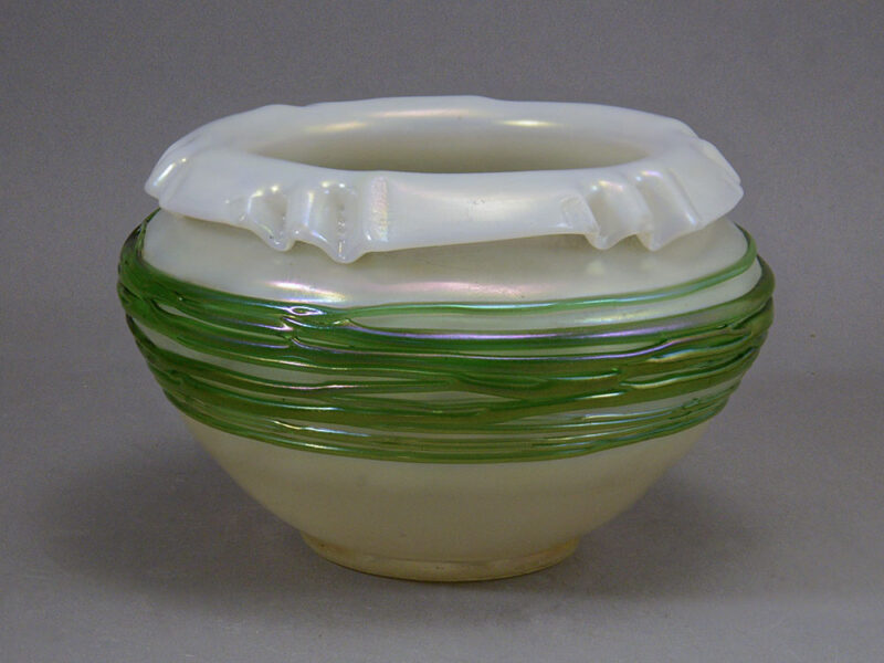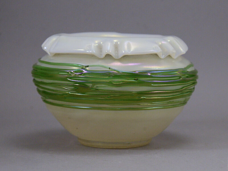 DESCRIPTION: The low bowl of iridized white opalescent glass is decorated with a carefully applied band of iridized green threading around a high shoulder, the rim is freely double crimped six times then rolled back and over the short neck. The whole raised on an integral pad foot.