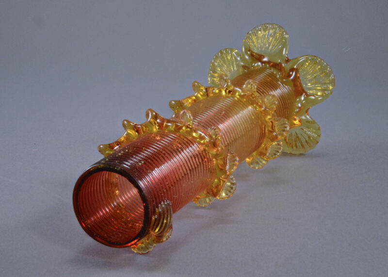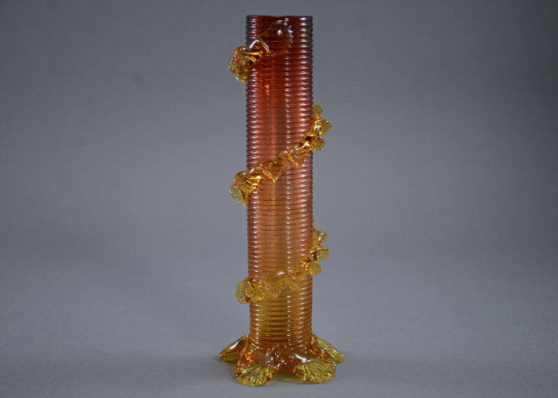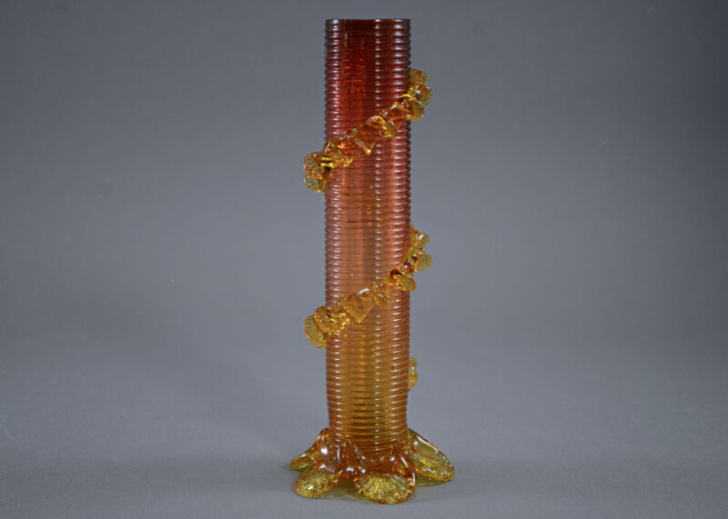 Summary: Antique British amberina art glass vase, with cylindrical machine threaded body surrounded by an applied crimp vine, all supported on an applied five crimp-footed base, likely Stevens & Williams or comparable quality.