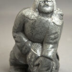 Carved in the bold Povungnituk (POV) style conveying the reality of the lived experience this carving is a dedication to the hard work and strong character of the Inuit peoples. A woman, a scarce subject matter for the predominately male subject matter of POV, a child on her back while lifting an object possibly wrapped in seal skin. The heft of the carving and necessities of Arctic Life is in contradiction to the humanism often attributed to female subjects, what George Swinton has called a ‘typically untypical paradox’ and attribute of POV carving. The resolute expression of both the mother and child, bold lines, and soft stone further convey both a pride and humility of being Inuit.