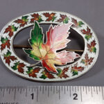 Edwardian sterling silver & champlevé enameled brooch, 2 ½” w. x 1 ¾” h., with a large central autumnal maple leaf surrounded by a wreath of dynamically shaped smaller maple leaves on a white ground, Canadian, circa 1904.