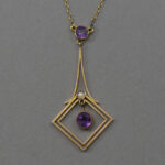 Description: A fine Edwardian 9 carat yellow gold lavaliere with a central round cut amethyst dangling from a pearl set at the apex of a double square, this is lowered from a second round cut amethyst attached either side to a delicate gold chain. Also referred to as a negligee necklace, it originates from England, c. 1900-1910.