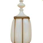 Outstanding hanging pendant light with lobed & cased opalescent glass body, enclosed by 6 vertical stripes held together by a substantial top & bottom ring embossed with scrolls and shells, attributed to Seguso, Murano, possibly Barovier, circa 1940s-60s.