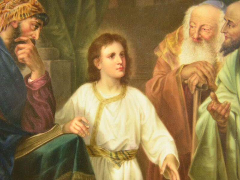 A young Christ stands in the Temple discussing and debating the nature of God amongst a group of five Jewish Elders.