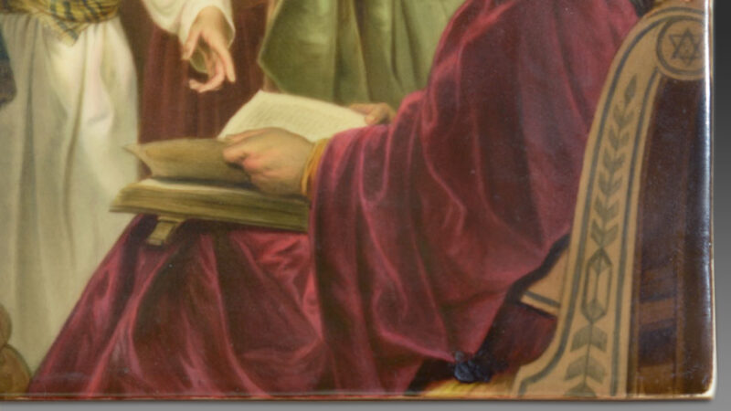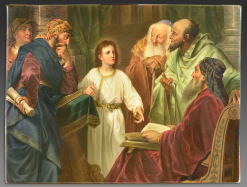 Summary: A fine original KPM porcelain plaque depicting ‘Jesus in the Temple’, attributed to Wagner, after Johann Michael Ferdinald Heinrich Hofmann (1824-1911). The original for this painting resides in the Dresden Art Gallery, Germany and an early copy in the Riverside Church, NYC having been donated by John D. Rockefeller, Jr..
