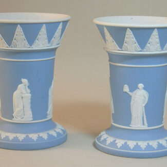 For Accuracy Only: one vase has light rubbing to the gilt and the other has an extremely tight hairline crack coming down from the neck, this is only noticeable under close inspection. The lids are included as a gratuity, both are damaged – these are nearly always missing and a welcome inclusion. The colours are bright, the painting very fine.