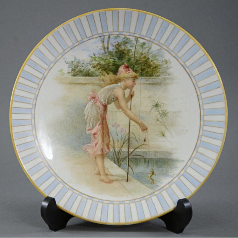 The scene depicts a classically inspired image of a youth, wearing a cap and pinafore, leaning on a fishing rod and pulling out of a pond the catch of a single fish, the stone garden wall parallels the pond trim, and excludes the wild forest peeking over the top from the otherside in favour of the cultivated water flowers and palm fronds within. The rim is further decorated with a blue and white linear border with yellow trim.