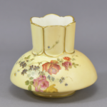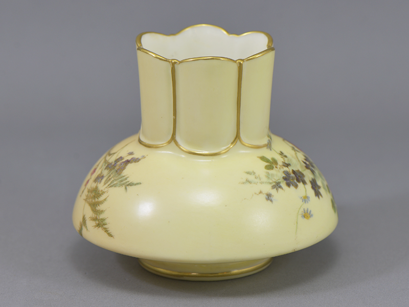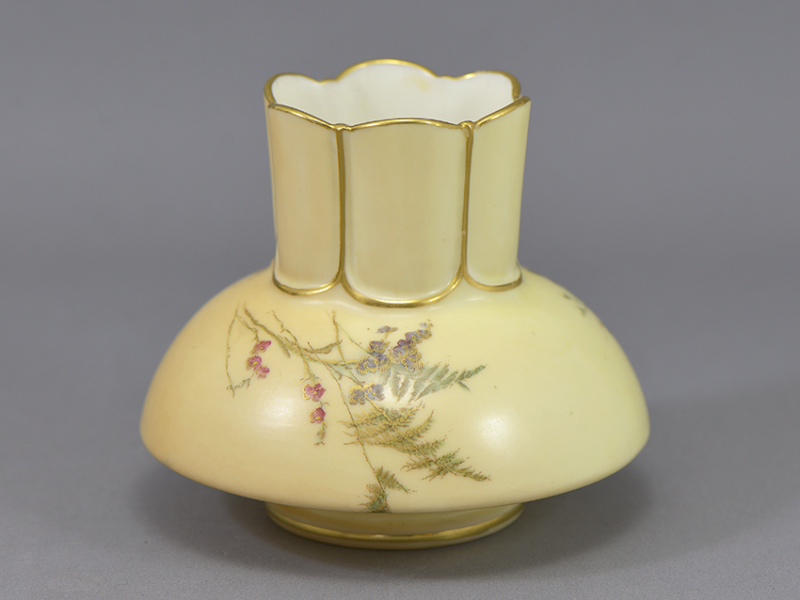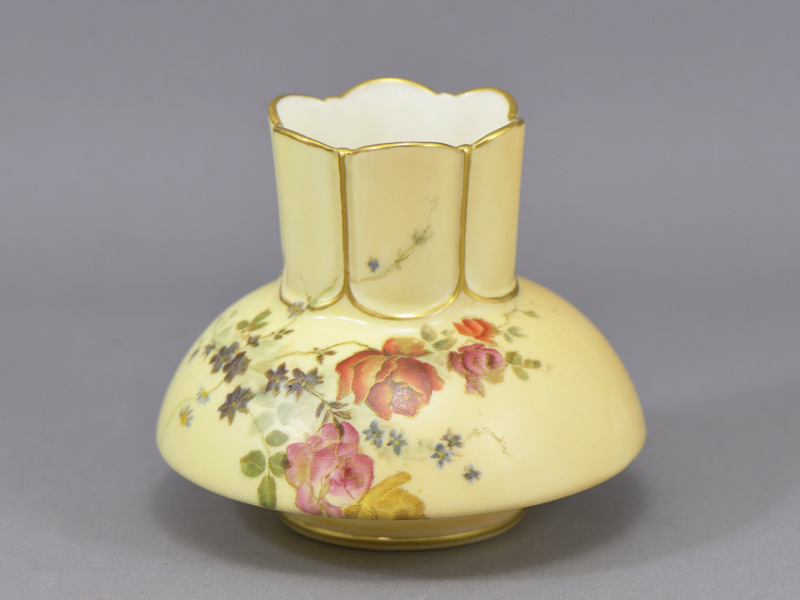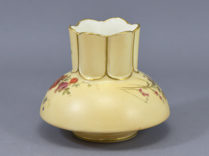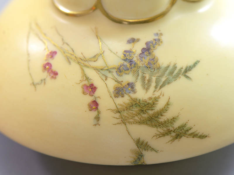 Description: British Aesthetic style ‘Blush Ivory’ vase decorated with “asymmetrical and scattered” hand-enameled “art sprays” of large red, pink and yellow roses among forget-me-nots, pansies marguerites, leaves and ferns, embellished along with the borders, in 22 carat gold, made by Royal Worcester, mould form number 991, registration number 957, circa 1894. The Japanese inspired form has a domed body with a sharp retracted waste, paneled stylized bamboo neck, all supported on a short integral columnar foot. Made of a parian porcelain body the decorating process was elaborate involving a total of five firings to build up the glazes and decoration to a finished state. The interior is glazed with a matt ivory , the exterior with a matt butter then further blushed with a matt apricot glaze before being painted with the flowers then gilt and burnished.