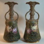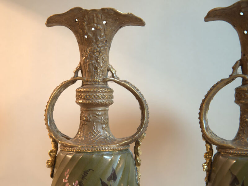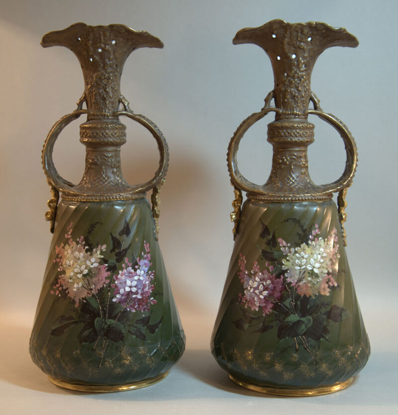 The large wrythen conical bodies extend upwards into a narrow neck flanked by large loop handles, supported by a band of applied gilt flowers, flaringly sharply at the mouth into a wide oval with an irregular almost floriform rim. The bodies are further decorated with hand-enameled lilacs and foliage over a ground of green, with burnished gilt to the handles, necks and foot representing faux ormolu mounts.