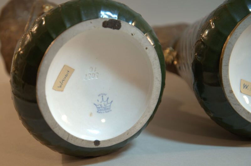 An impressive matched pair of tall double handled Amphora vases, made by Ernst Wahliss, Turn-Teplitz, Austria, appropriately stamped on base with maker’s mark and impressed “5057/10” c. 1894-1918.