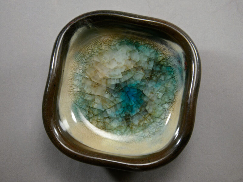Deichmann Pottery dish in a combination of glazes, possible one of the experimentals, made by Kjeld and Erica Deichmann, New Brunswick.