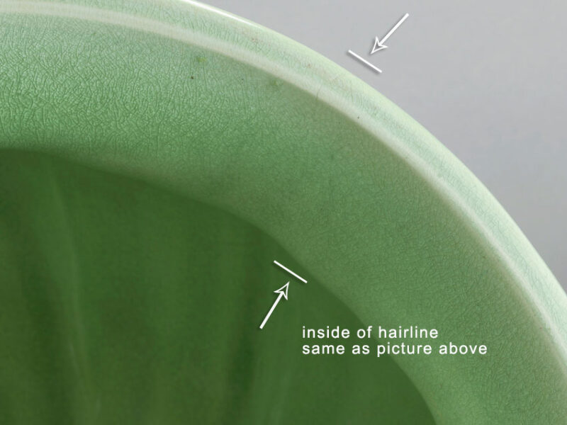 Condition: A period piece, it is offered in good original condition, no repairs. For accuracy only: there is a tight 2” hairline at the rim and a long branching craze on the base (not a crack). Otherwise it is in excellent antique condition with uniform overall crazing and a couple of glaze misses from production, these are not damage and not in any way notable or exceptional to what is expected. The celadon glaze and Arts & Crafts ornament are superb and it is ready for use and display.