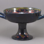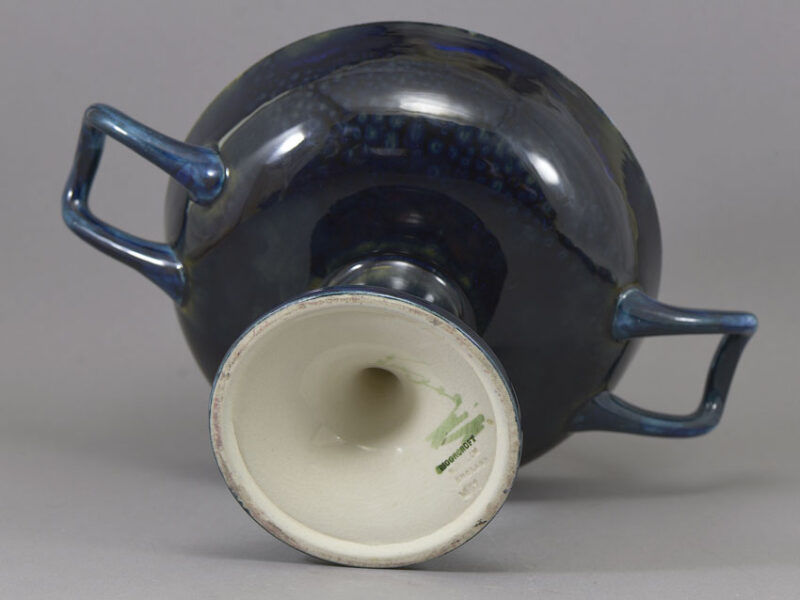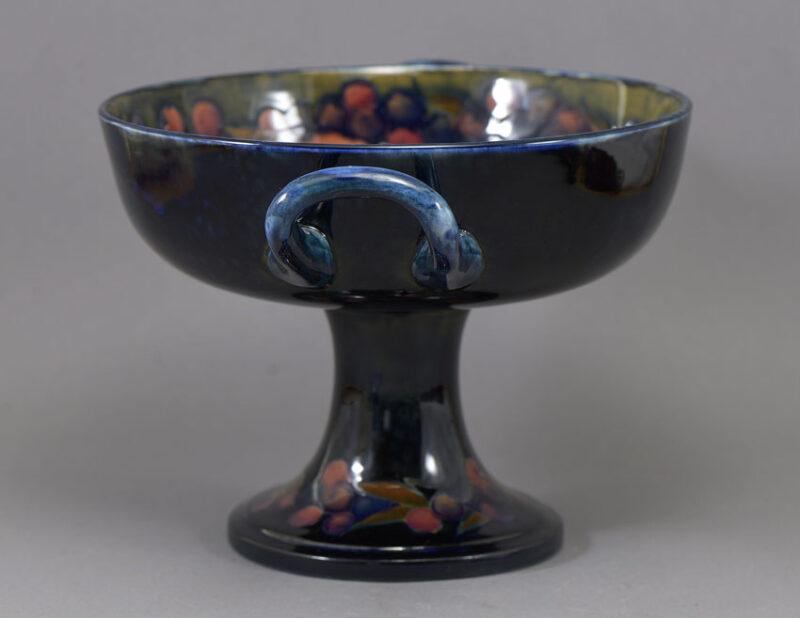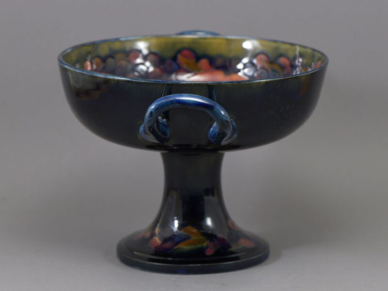 SUMMARY: Rare British pottery raised and handled ‘trophy bowl’ decorated in the ‘Pomegranate’ pattern, designed by William Moorcroft (1872-1945) for Moorcroft Pottery (est. 1897), Burslem, Stroke-on-Kent, Staffordshire, England, 1913-1918.