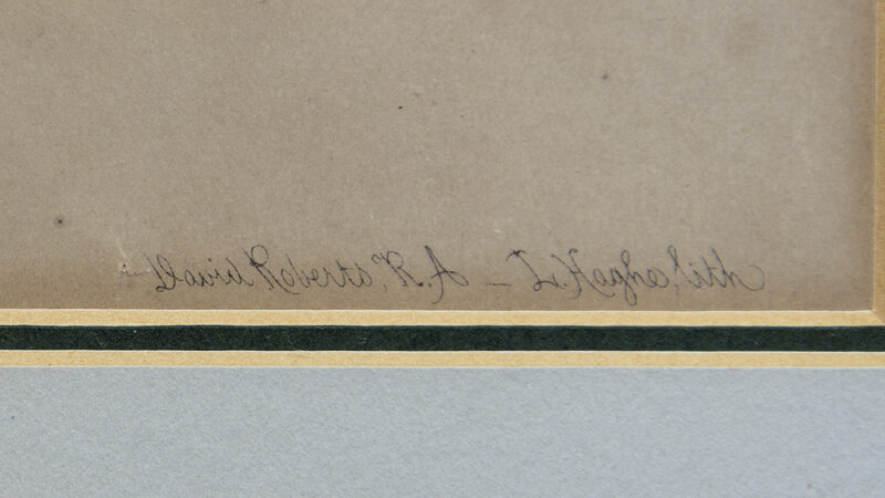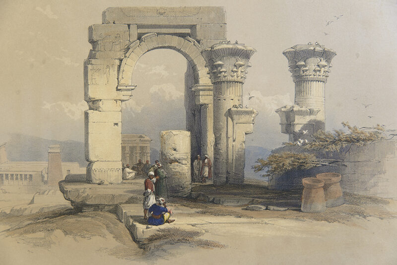 Markings: titled in lithograph lower left, ‘Ruins Temple in the Island of Bigge, Nubia’”; signed in litho. Lower right, ‘David Roberts. R.A. – L. Haghe Litho.’
