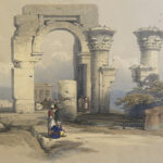 Notes: “This Temple is situated on an island close to that of Philae; owing to its greater elevation, it overlook that island and the Nile, and one of the finest points of view of the temples of Philae, from Bigge, is a scene which has already been given in this Work. Wilkinson considers that the Temple of Bigge is of great antiquity, from some granite remains and the inscriptions which they bear. The columns, however, which are seen in this sketch as part of the grand entrance, are evidently Ptolemaic, and have formed a portion of a previous portico. In advance of these, ascending from the river, once stood the flanking towers of the propylon, which commanded the outer court or dromos, of which that which now surrounds the arch was a portion; this may be traced by the sculpture which still exists. The arch is an addition of a later period; Wilkinson says, of the Christian era: it presents a singularly incongruous appearance in the midst of Egyptian architecture. The ruins are surrounded by a miserably mud built Arab village. The Temple of Bigge from its elevated situation, to which the approach was by a flight of steps, must have exhibited a noble appearance and produced a very striking effect. The present Temple appears to have been commenced by Euergetes I., and was dedicated by him to Athor; it was completed by the Caesars: but Wilkinson conjectures, from a red granite statue found there, that an edifice existed on Bigge as told as Thothmes III. Or Amunoph I., and that Bigge is the Baton of Seneca, in spite of the doubts expressed by other Egyptian antiquaries.” David Roberts Journal