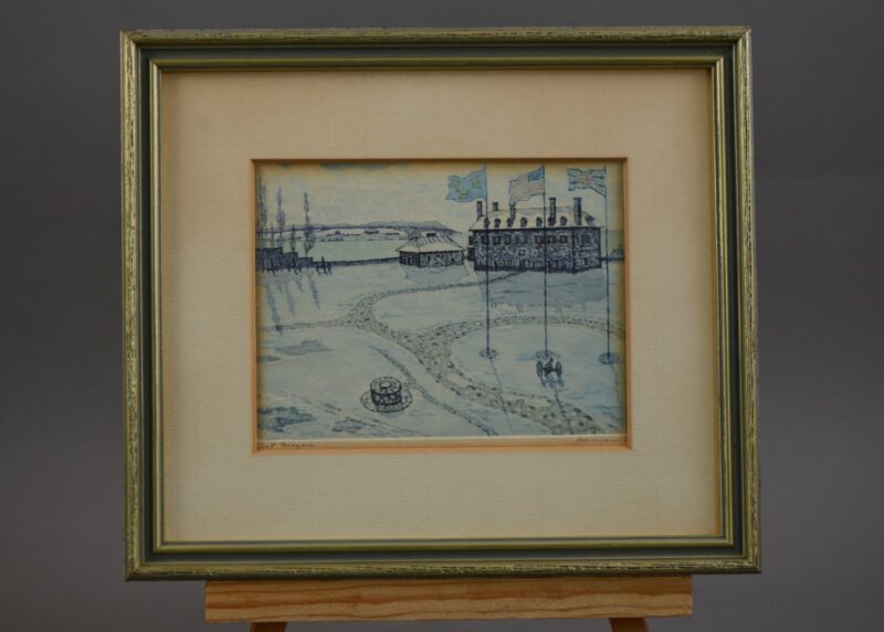 Notes: “Historic Old Fort Niagara / An Ancient Gateway to the West / On that corner of the peninsula in New York State, looking north over Lake Ontario, looking west across the mouth of the Niagara River, is this historic fort, first built in 1726 under the direction of Louis Thomas de Joncaire by Gaspard de Lery under a French appropriation of approximately six million dollars. It was called a chateau so as not to arouse the suspicion and hostility of the Indians, but it had walls four feet thick, huge interior stone arches to take up the repercussions of cannon fire, and inside was a well as a precaution against siege. Cut stone for window and door casements was shipped from Frontenac (Kingston) but the timber came from the woods nearby. Between 1750 and 1759 the fort was converted into an elaborate stronghold with its system of earthworks, moats and powder magazine. Sir William Pitt had said in parliament that, next to the citadel at Quebec, Fort Niagara was the most important post in America and must be taken at all costs. The English assault came in July ’59. The battle took place south of the Fort and is known in history as La Belle Famile. Over six hundred soldiers, eleven officers and their wives marched out of Fort Niagara as prisoners of war. The French had lost the key to the west and a new era had begun with Sir William Johnson as commander at the Fort. The English held Fort Niagara after the Treaty of Paris, until 1796, when the United States took possession. So, as the engraving shows, Fort Niagara has been under three flags. The task of rehabilitating the Fort was completed in 1934 and is one of the finest works of restoration in America.” ~ Louis Blake Duff
