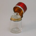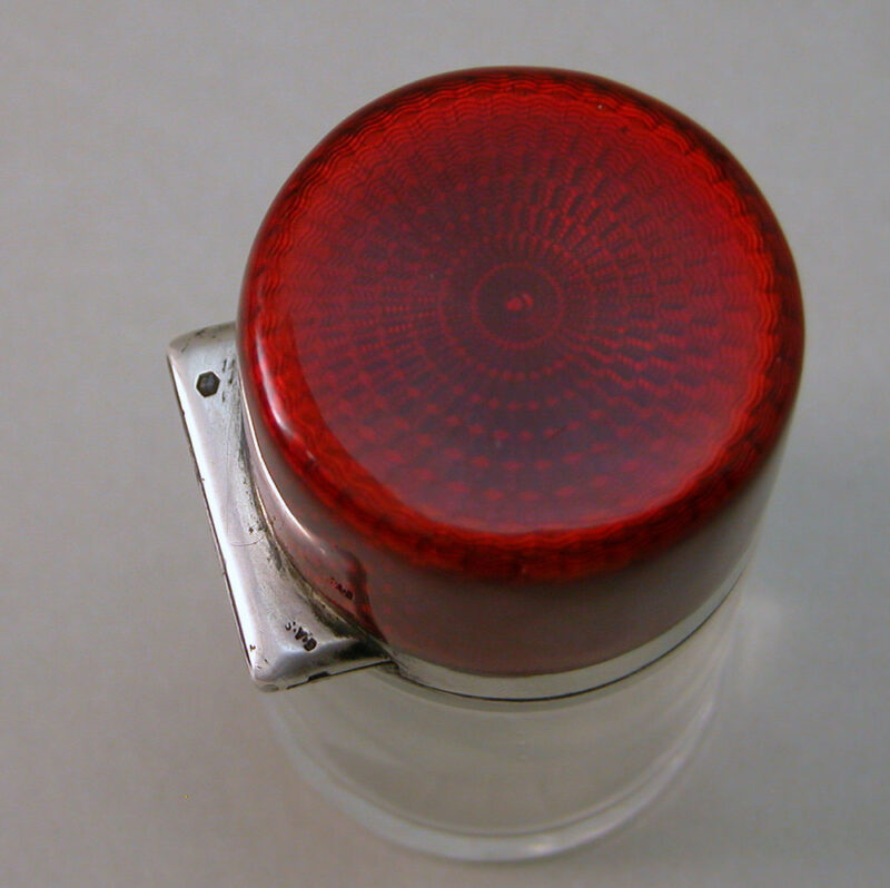 French smelling salt bottle, a silver-gilt and red enamel guilloche hinged lid on a crystal body with star cut base, original stopper, marked, circa 1900.