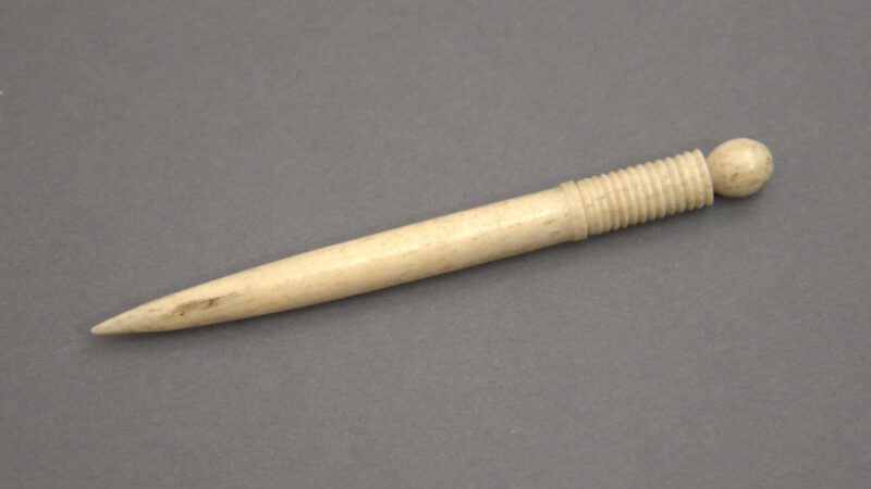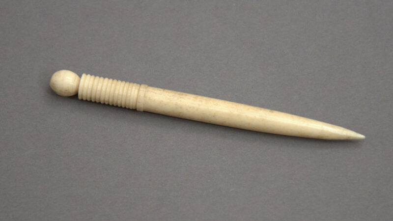 “Sewing stilettos were used for a number of needlework tasks. Many of the bodices of the time were laced with cord, and the stiletto was used to make the lacing holes, which were then embroidered in buttonhole stitch, in the fabric. Many garments, as well as handkerchiefs, were embellished with crocheted edges. A stiletto was used to make holes in the edge of the fabric through which the crochet hook was passed to create the trim. The stiletto was an indispensable component of any needlework tool set.”