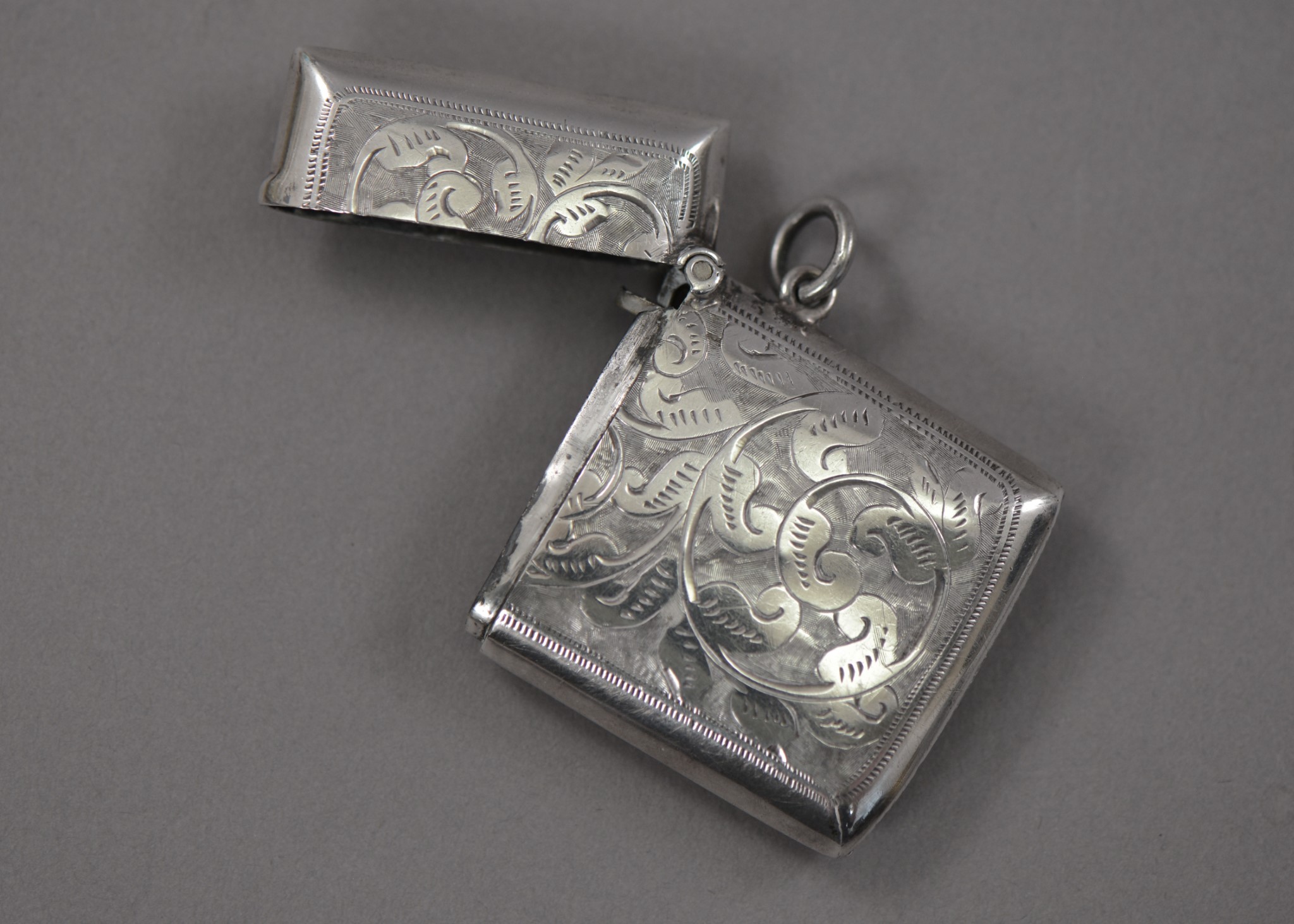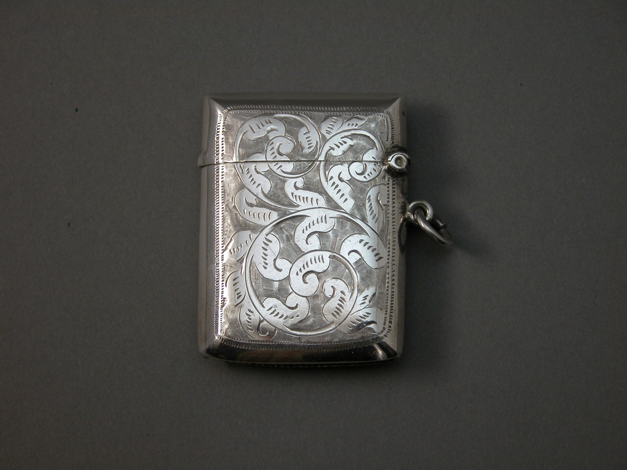 An English made (“J.G”, Birmingham, 1900-1) sterling silver match safe / vesta case of rectangular form with a hinged flip top, angled plain edges, engraved on one side with allover foliate scrolls while the other side is similarly engraved except for the lower right corner which was left plain for an inscription but was left vacant. It has a ring just below the hinge so that it may be used as a watch fob, is 2 inches high x 1 ½ inches wide x 3/8 inches thick and weights 26.5 grams = .85 troy ounces = .93 ounce. Fully hallmarked.
