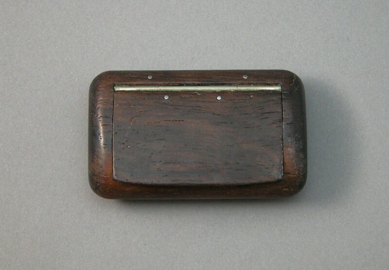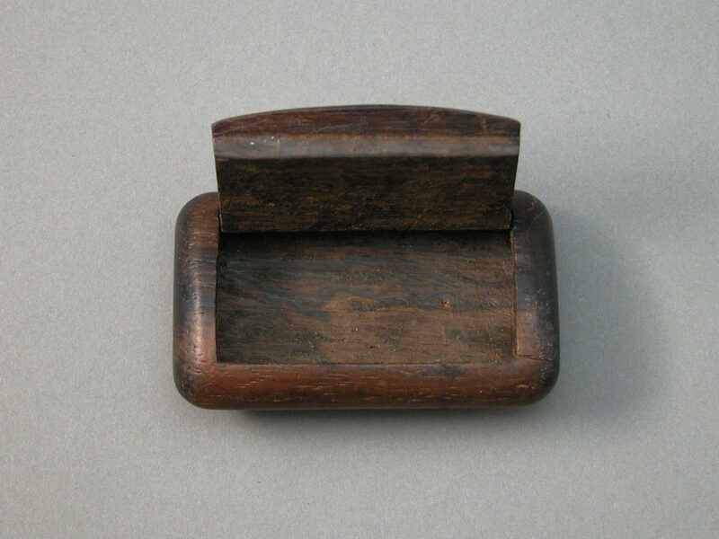A dark rosewood snuff box of rectangular shape with rounded edges that give it the appearance of being oval when looked at end on. 2 ¾” long x 1 1/16” wide x 2/4” deep, it dates to the late Victorian era, circa 1860-1880. The main body is hollowed out by hand from a single piece of wood and the hinged lid is affixed by a hidden internal bar with four hinge pins showing on top. The front end of the snuff boxes lid curves slightly upwards forming a thumb life for easy accessibility.