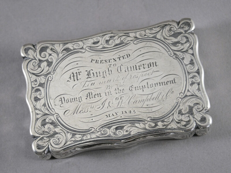 The inscription reads: “Presented / to / Mr Hugh Cameron / As a mark of respect / By the / Young Men in the Employment / Messrs J & W Campbell Co.” The firm of Messrs. J & W Campbell & Co (1817-1960’s) was, at this time, located on Cendleriggs St, Glasgow. This dates prior to the move into the iconic building on Ingram St. in 1856 where it would employ over 600 people. In 1922 it merged to become Campbells and Steward & McDonald, which was subsequently taken over by the House of Fraser during the 1960’s.