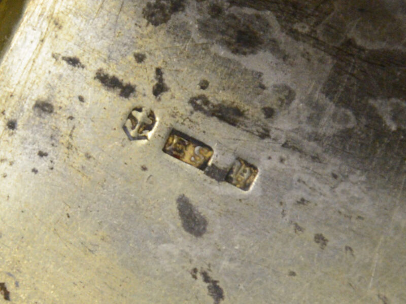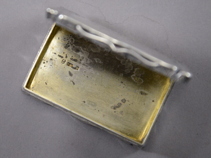 Markings: marked inside lid, [Victoria head duty mark], [Edward Smith ‘ES’ makers mark], [Lion Passant]; stamped inside base, “[Birmingham Anchor], [‘ES’ makers mark], [1843-44 ‘u’]