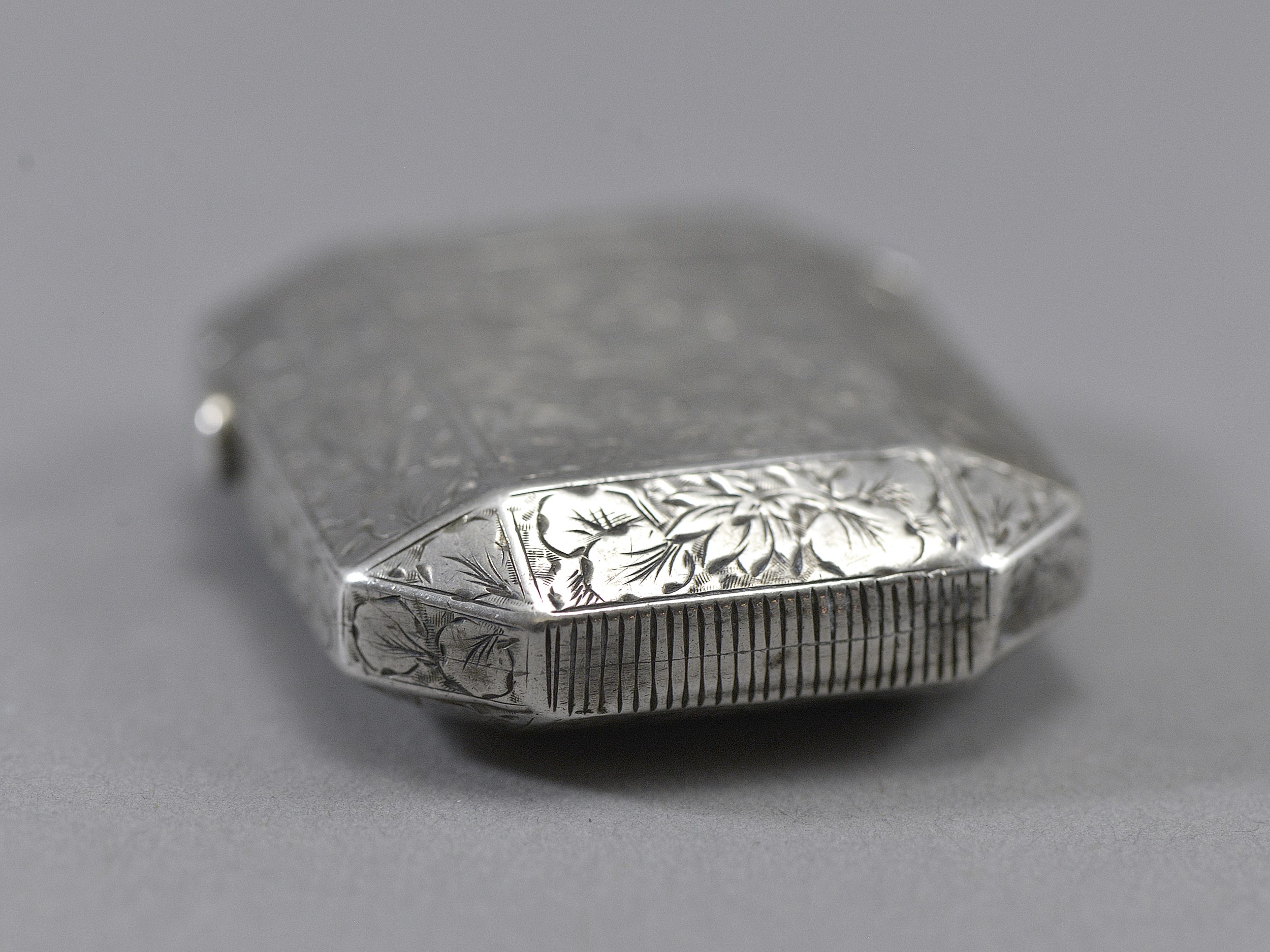 This essential point has not been lost in the manufacture of this match safe. Made of heavy gauge sterling silver with canted corners and sides it is deeply engraved with a repeating leaf pattern between form-delineating cross-banding. The catch is strong with a push button release and the integral hinge remains secure. A strike is engraved onto the base to provide a uniform textured surface for lighting a match.